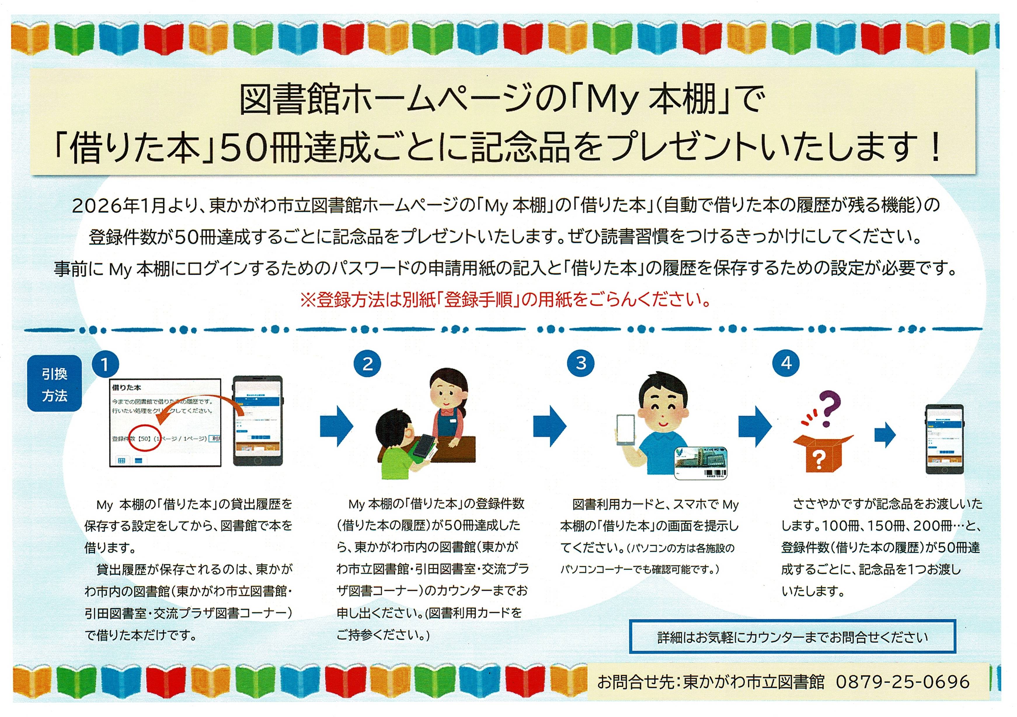 大変ご迷惑をおかけし申し訳ございません。 - お知らせ 令和8年1月より、図書館ホームページの「My本棚」で「借りた本」50冊達成ごとに記念品をプレゼントいたします! ⇒詳細はこちら ⇒登録手順はこちら